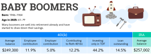 - For baby boomers, the average 401(k) balance is $249,300 with an average IRA balance of $257,002.