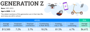 - Gen Z investors have an average 401(k) balance of $13,500 and an average IRA balance of $6,672.